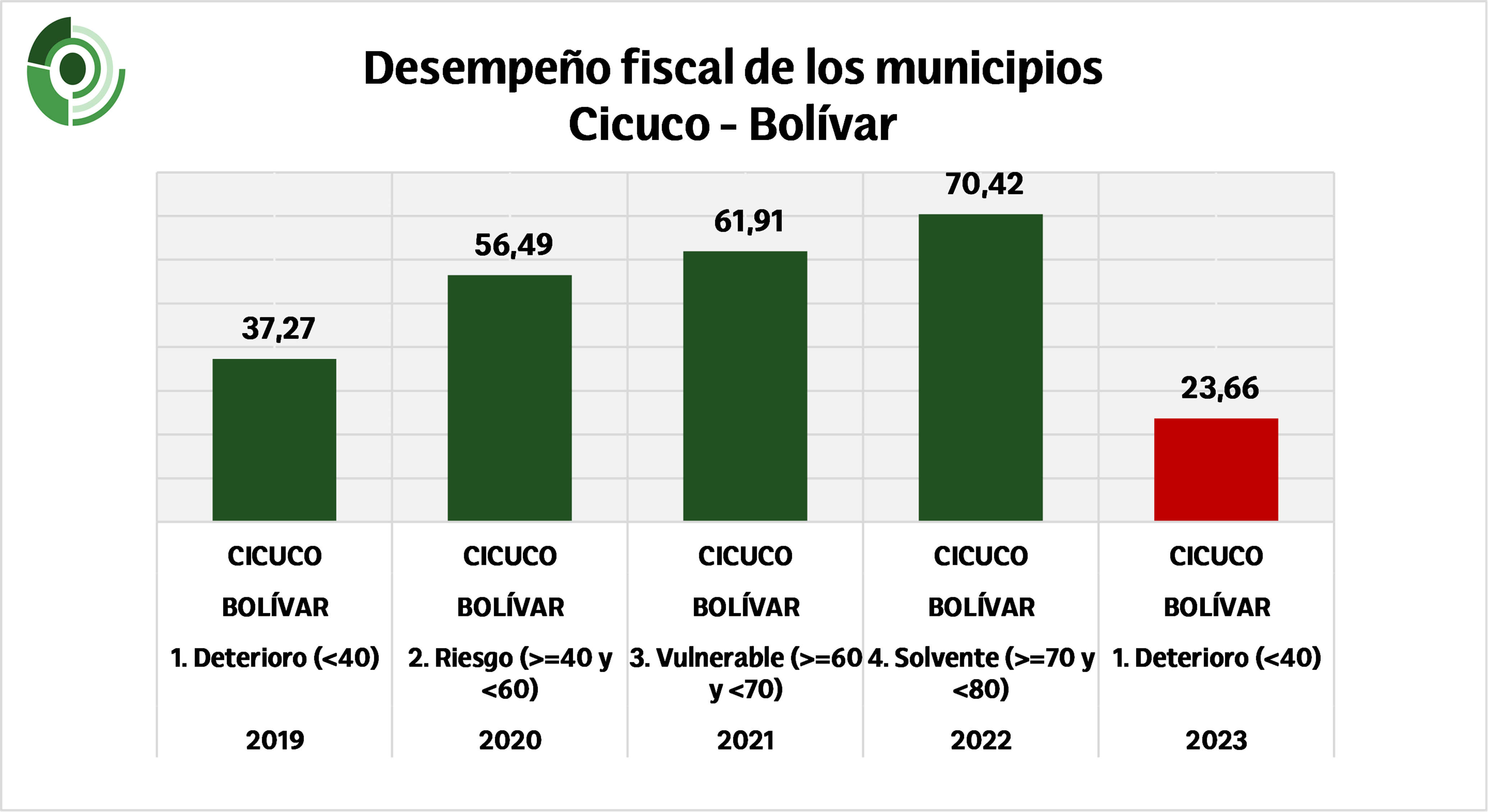 Otro municipio que mostró un avance importante es Alto del Rosario, que ascendió de 43,30 a 62,73, también ingresando a la categoría «Vulnerable». Este resultado demuestra que, a pesar de los desafíos, es posible revertir situaciones de riesgo cuando se implementan políticas fiscales más rigurosas y una mejor planificación presupuestal.