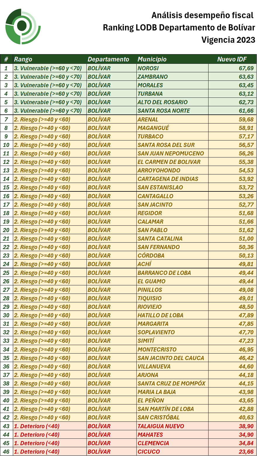 El panorama del IDF 2023 en los municipios de Bolívar evidencia tanto avances notables como retrocesos preocupantes. Los municipios que han mejorado deben ser ejemplo para los demás, demostrando que con una gestión financiera rigurosa y el uso adecuado de los recursos públicos, es posible superar situaciones de riesgo.