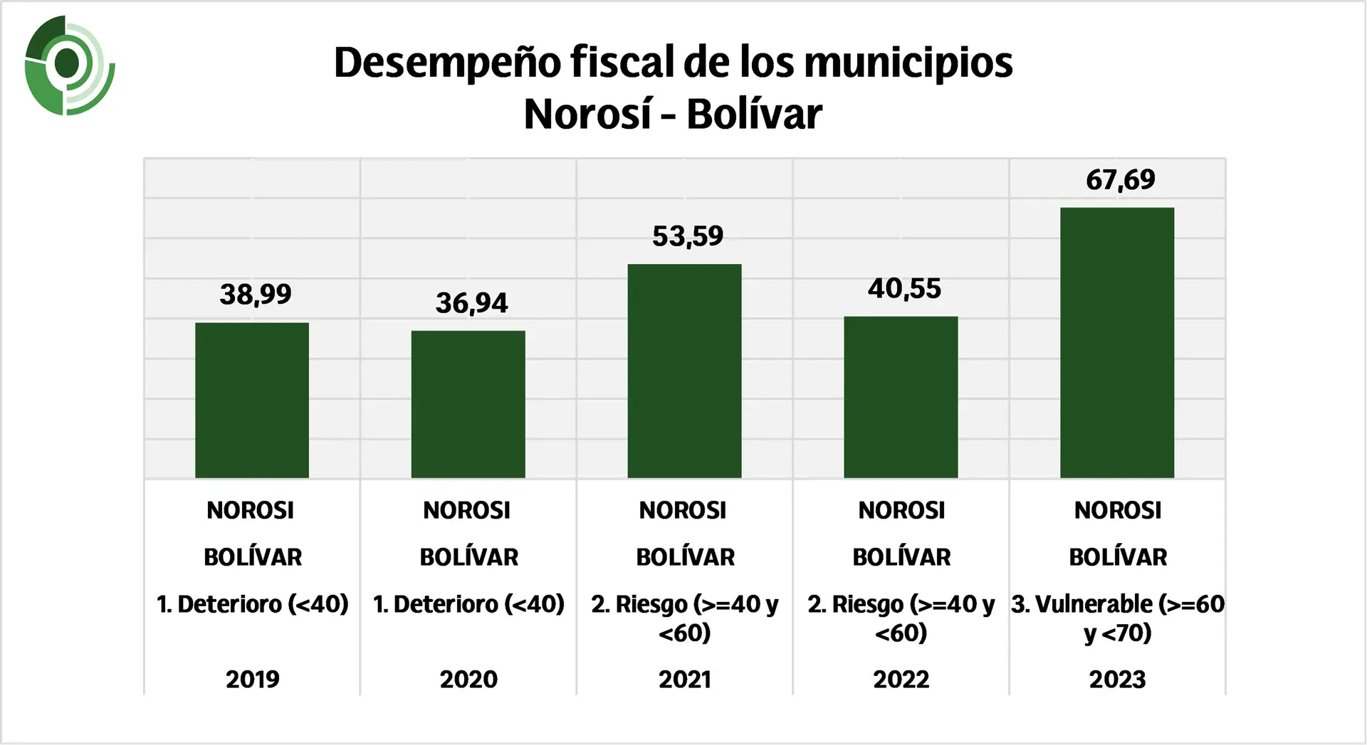 Uno de los casos más destacables de esta edición del IDF es el municipio de Norosí, que pasó de un puntaje de 40,55 en 2022 a 67,69 en 2023. Este avance de casi 30 puntos lo ubica en la categoría de «Vulnerable», un logro que denota un manejo mucho más eficaz de sus finanzas. La mejora de Norosí evidencia un esfuerzo conjunto de sus autoridades para optimizar la administración de sus recursos.