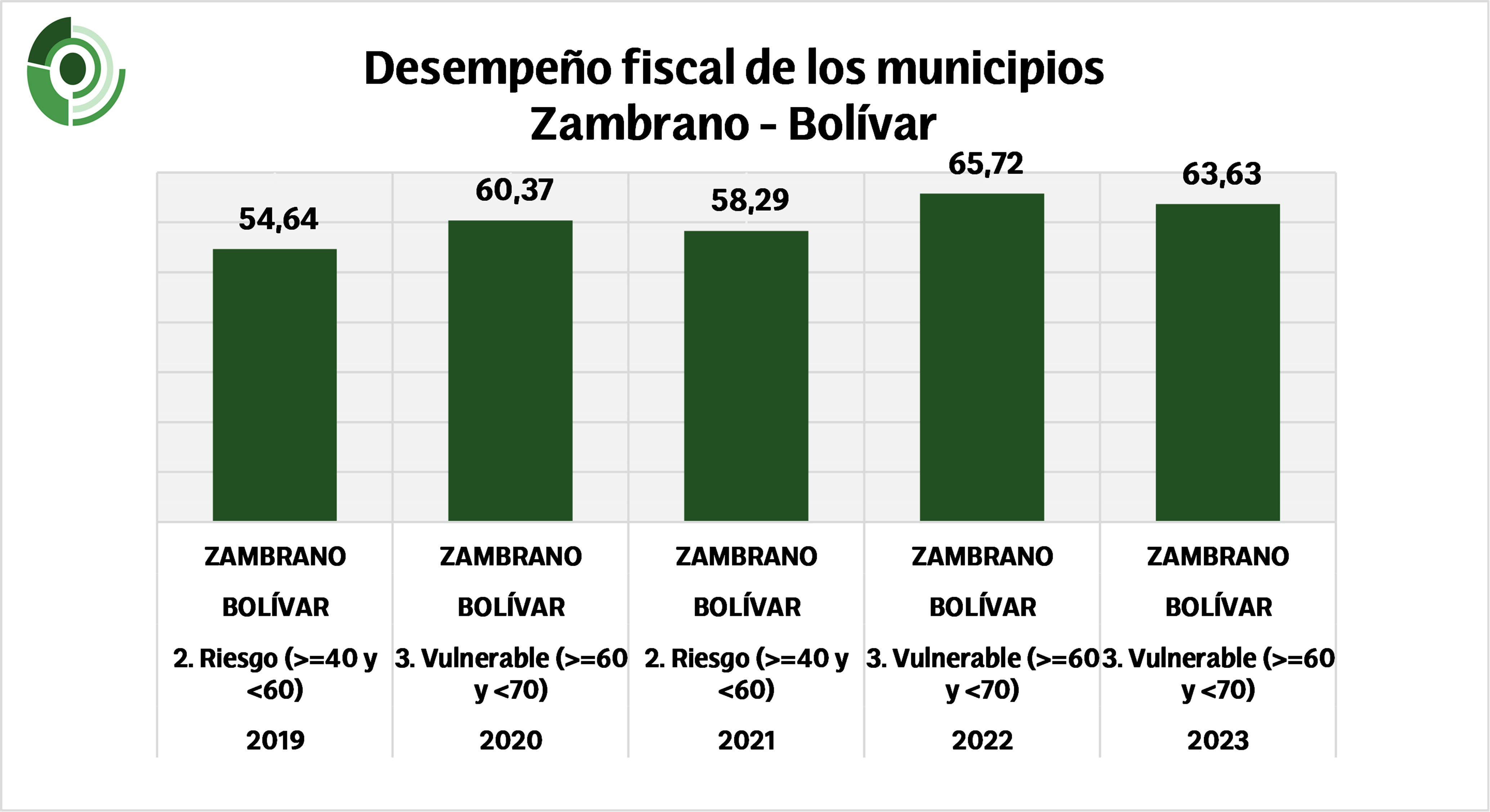 Algunos municipios han logrado mantenerse estables en su desempeño, aunque esto no necesariamente significa que estén fuera de peligro. Zambrano, por ejemplo, que tuvo un IDF de 65,72 en 2022, apenas disminuyó a 63,63 en 2023, manteniéndose en la categoría «Vulnerable». Aunque el municipio no experimentó una caída significativa, la estabilidad no es suficiente si no se generan avances que lo lleven a una categoría de mayor solvencia.