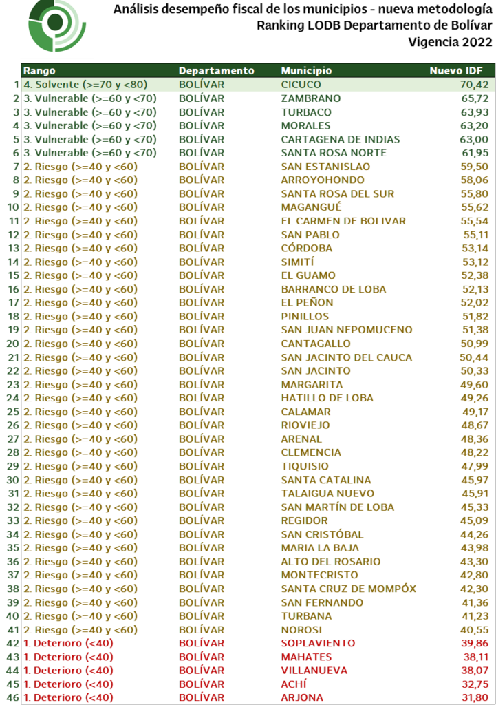 En resumen, los resultados del IDF para 2022 subrayan la disparidad en el desempeño fiscal de los municipios de Bolívar. Mientras algunos merecen reconocimiento por su excelencia, otros enfrentan cuestionamientos serios. La mejora de la gestión fiscal en los municipios en deterioro no solo es esencial para su propio bienestar, sino también para promover un desarrollo equitativo y sostenible en toda la región.