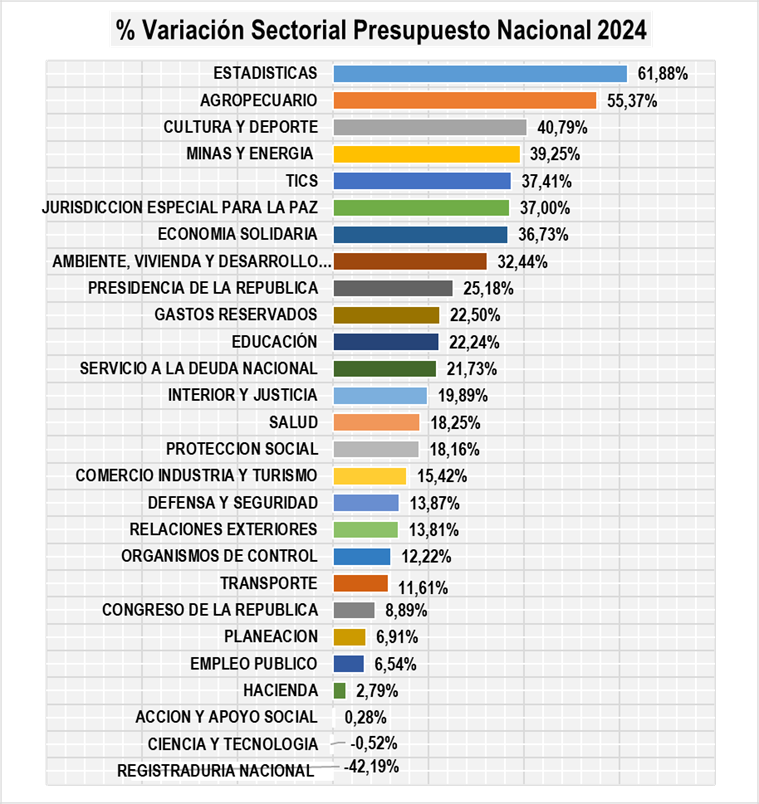Destacan dos sectores que experimentarán un cambio significativo en 2024: El sector de Estadística y el sector Agropecuario están en el centro de atención. La Agencia Nacional de Tierras (ANT) en el sector Agropecuario verá un impresionante aumento del 394% en su presupuesto, mientras que el Instituto Geográfico Agustín Codazzi (IGAC) en el sector Estadístico recibirá un incremento del 232%.