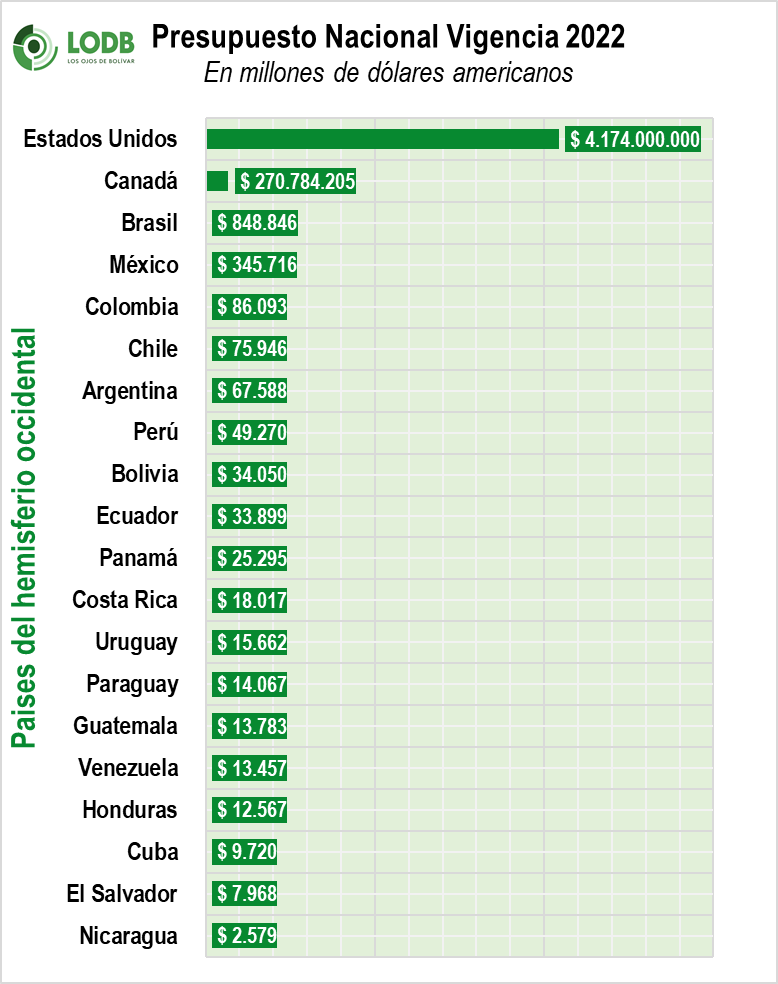 Nuestra veeduría realizó seguimiento al presupuesto anual de veinte (20) países del hemisferio occidental aprobado para la vigencia 2022. Los cinco (5) países con mayores presupuestos son: Estados Unidos de América, Canadá, Brasil, México y Colombia; del mismo modo, los cinco (5) con menores presupuestos son: Venezuela, Honduras, Cuba, El Salvador y Nicaragua.